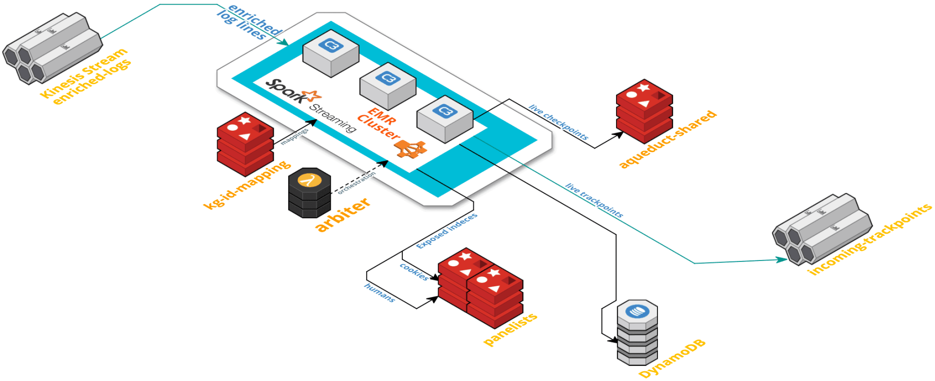 Our data processing component is an Apache Spark application running along living streaming job. It reads data from Amazon Kinesis and then offloads the work to the cluster’s slaves. The Spark Streaming job runs in cluster mode on top of YARN. All of the filtering, grouping and aggregation usually happens within 150 seconds at peak loads. This is, of course, much faster than the 300 seconds limit above which we wouldn’t be able to keep up with the incoming data. To cope with increased traffic, we scale the Spark Streaming application simply by adding more slaves to the cluster.